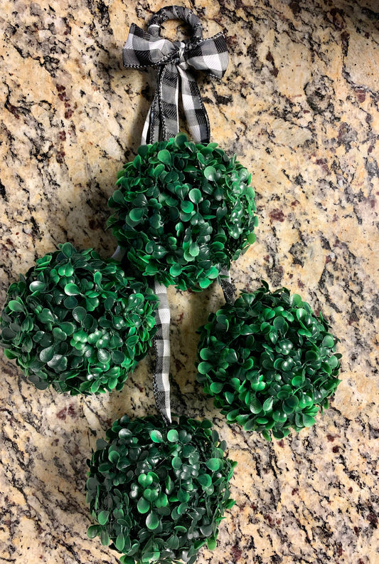 Greenery Sphere Door Hanger with Black and White Buffalo Check Ribbon | Boxwood Topiary | Door Swag